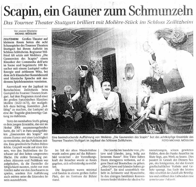 Großes Theater auf kleinem Raum boten die acht Schauspieler des TTS bei ihrem Auftritt im ausverkauften Jagdsaal des Barockschlosses Zeilitzheim. Trotz des namhaften Stoffes gelang es dem jungen Ensemble die 1671 in Paris uraufgeführten "Gaunereien des Scapin" mit einem Humor und einer Leichtigkeit zu vermitteln, die das Publikum mitriss....